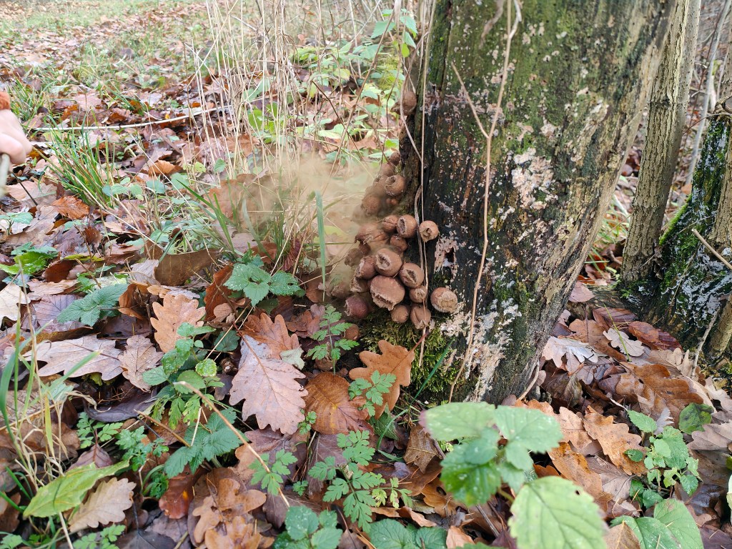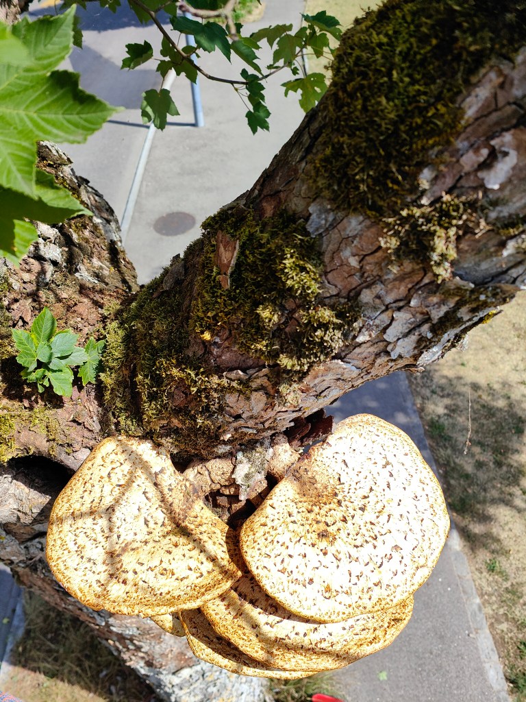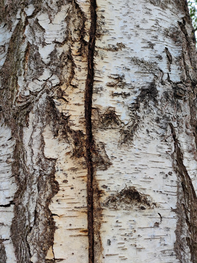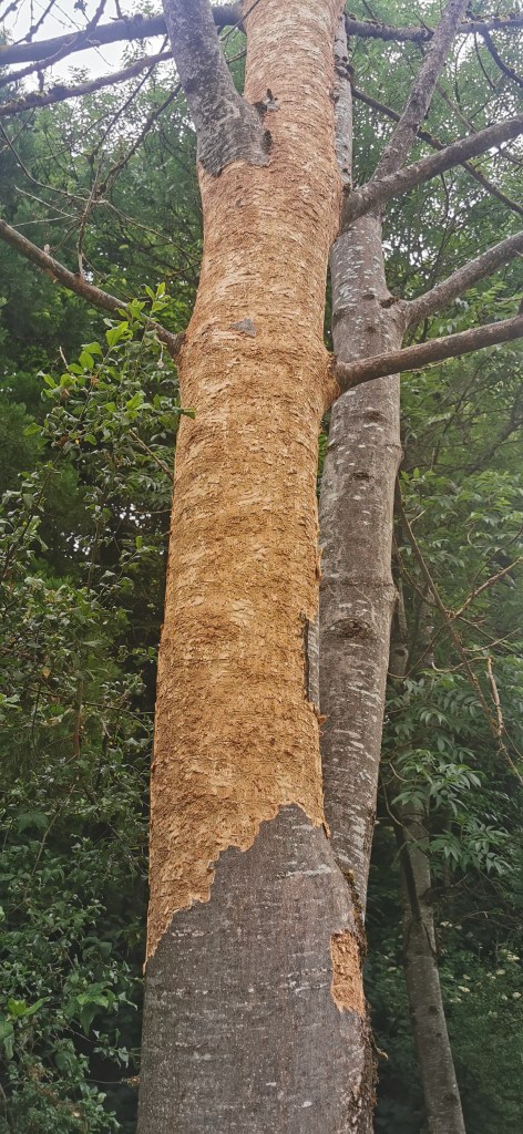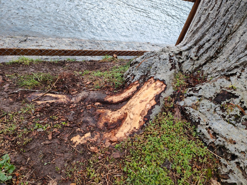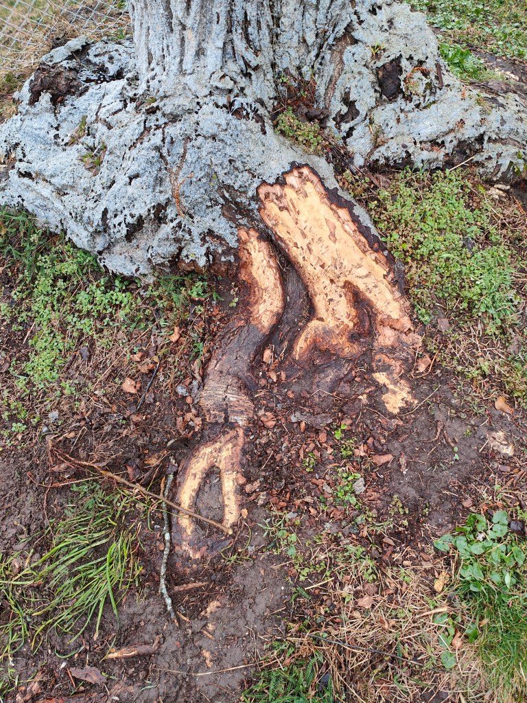 Die Graue Färbung stammt von sogenannter Biberschutzfarbe, diese bildet eine mechanische Schutzschicht vor Biberfrass. In diesem Fall war die unannhemlichkeit dem Biber wohl egal.